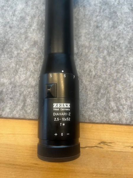 Gut erhaltenes Zeiss Diavari 2,5-10x52 T* („die Legende“) mit einer Außenschiene/Trapez-/Prismenschiene. Absehen 11 (Abs. 1 mit verjüngenden Balken) ohne Leuchtpunkt. Zoom und Absehenverstellung funktionieren problemlos. Linsen klar, keine erkennbaren Kratzer. War montiert, deshalb Bohrungen in der Schiene. Eine passende Blaser Sattelmontage gibt es in einer anderen Aktion von mir.
