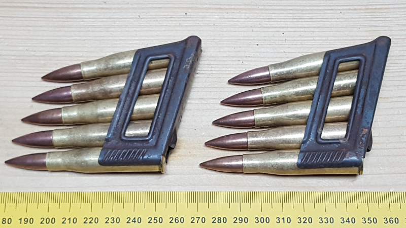 Sammlermunition: 10 Dekopatronen 8x56R Ungarn auf Ladesrteifen.