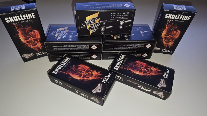 Verkaufe hier 250 "Schuss" Black Blitz 9mm PAK und 194 "Schuss" Skullfire 9mm PAK für Schreckschuss Pistolen.