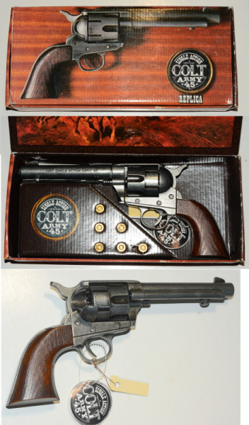 schwere Replika des Colt Army SA 1871, spanische Fertigung, in Originalgröße und Gewicht des echten Revolvers, unbenutzt und in original Verpackung und mit 6 Dummypatronen, die mit Spielzeug-Zündkapseln geladen werden können. Die Waffe ist neuwertig, der Karton außen mit Lagerspuren