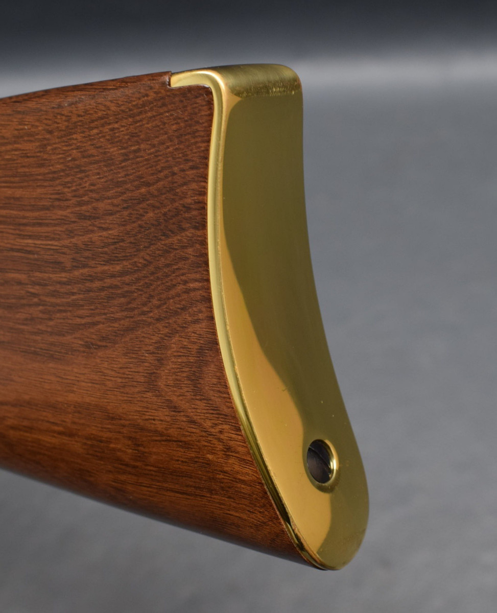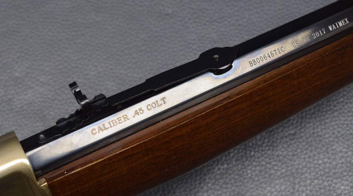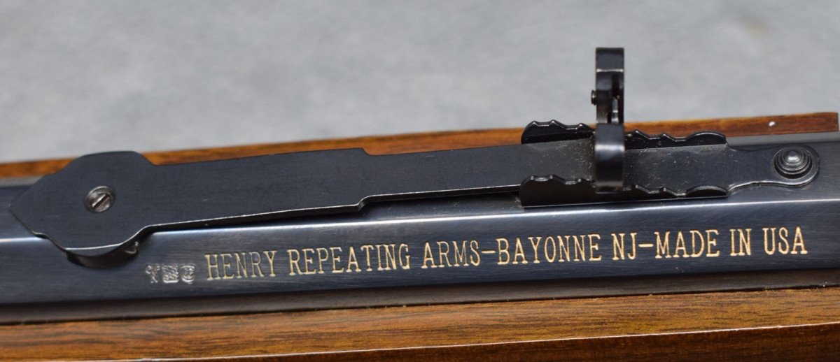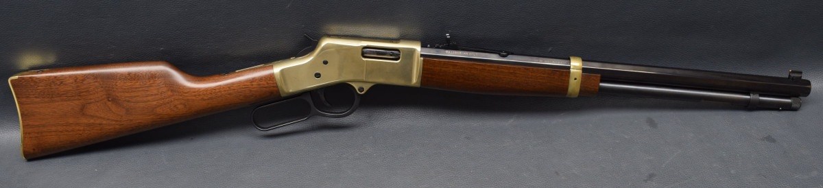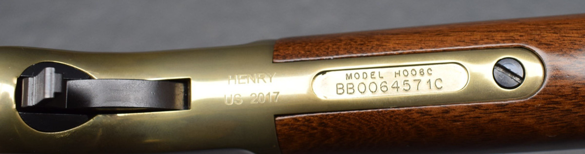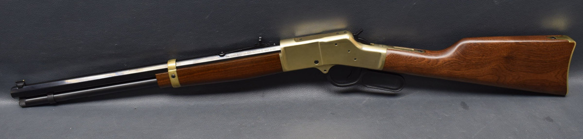 Laufring und Schaftkappe sind ebenfalls aus Messing. 10+1-Schuss Magazinrohr, Nusßholzschaft, Links auf dem Lauf der Schriftzug "Henry Repeating Arms-Bayonne NJ-Made in USA"