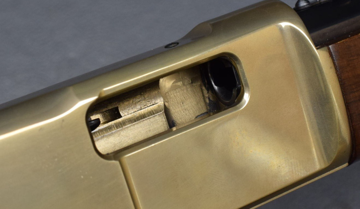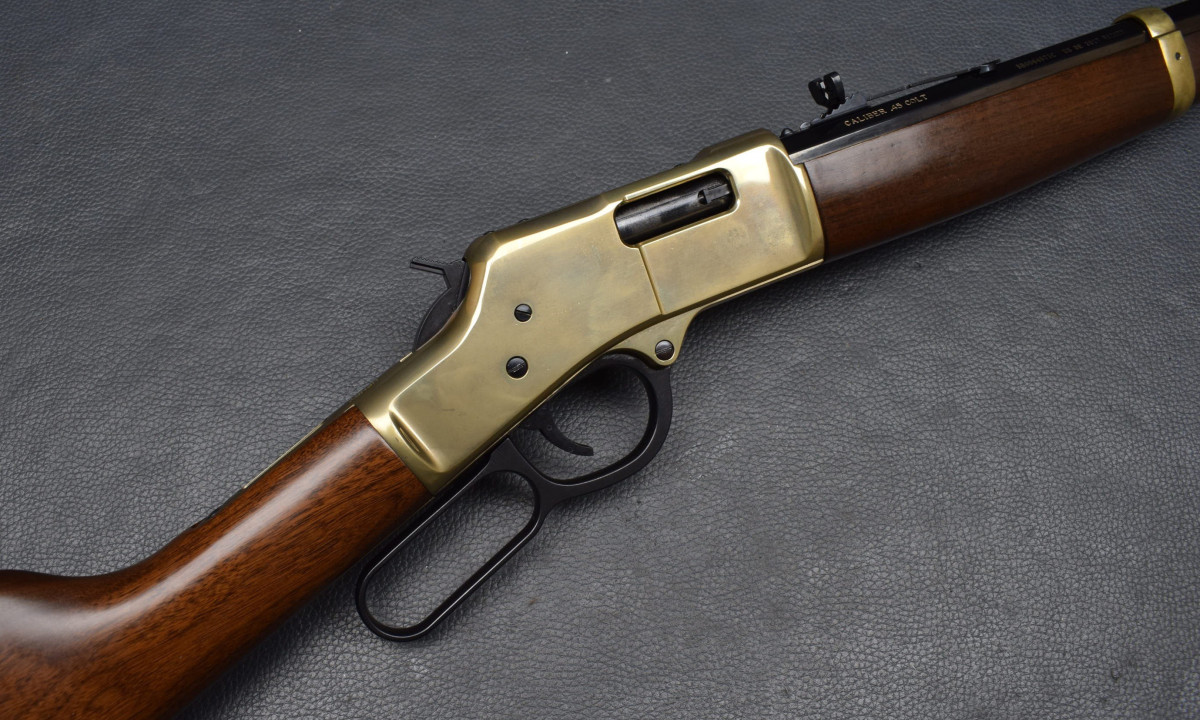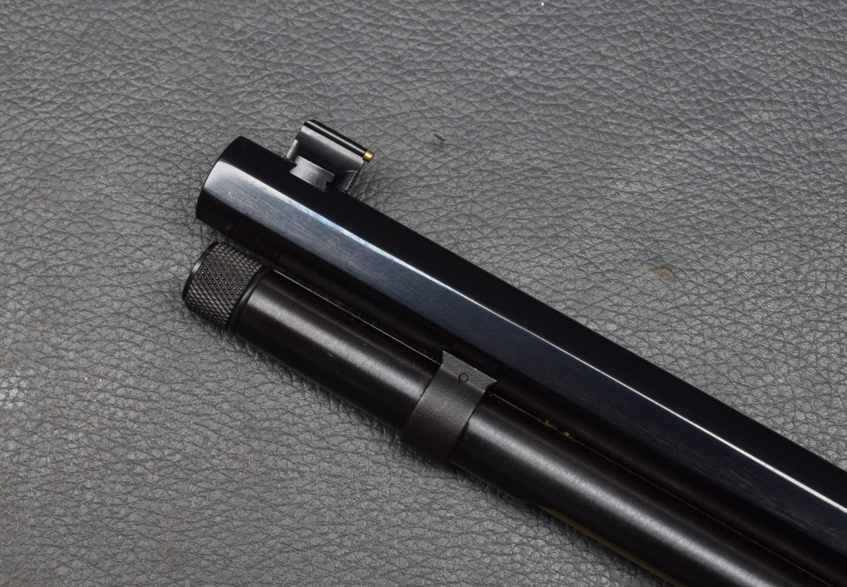 Laufring und Schaftkappe sind ebenfalls aus Messing. 10+1-Schuss Magazinrohr, Nusßholzschaft, Links auf dem Lauf der Schriftzug "Henry Repeating Arms-Bayonne NJ-Made in USA"