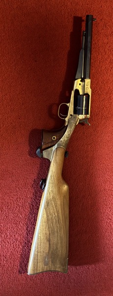 Artikelbeschreibung: Seltener Remington New Army Schreckschuss Revolver mit Schulterstütze Die Waffe ist voll funktionsfähig und eignet sich ideal für Sammler, Western-Fans oder für den Einsatz mit Platzpatronen im Rahmen der gesetzlichen Bestimmungen Der Rahmen ist aus Messing passend zur Western optik Dabei ist eine Passende Schulterstütze die ab und angeschraubt werden kann Trommeln fast 6 Schuss 9mm Knall Patronen PTB ist 862