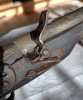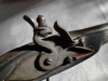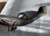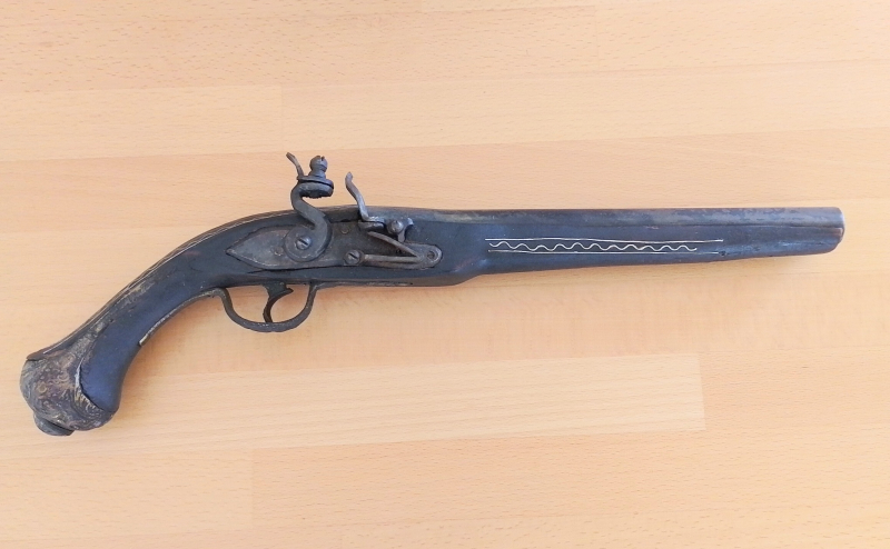 Aus Sammlungsauflösung verkaufe ich diese Steinschloßpistole. Vermutlich Südeuropa/ Balkan / Osmanisches Reich 18. Jahrhundert. Länge ca. 45cm. Alterspuren deutlich vorhanden, jedoch keine massive Beschädigungen, am Holz keine erheblichen Risse oder Ausbrüche. Feuerstein nicht vorhanden. Die Mechanik ist sehr schwergängig ( eventl. innen verharzt ) aber funktioniert. Einlegearbeiten im Holz ( Messingdraht? )