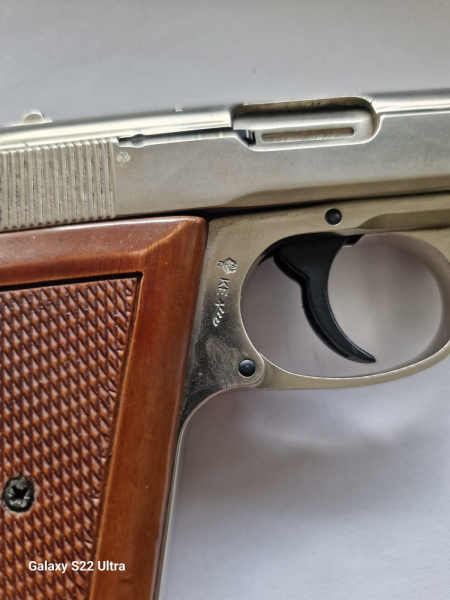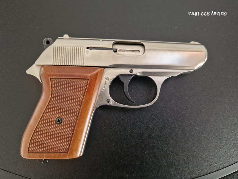 Waffe ist verchromt mit Holzgriffschalen