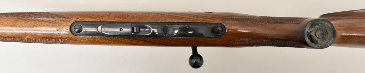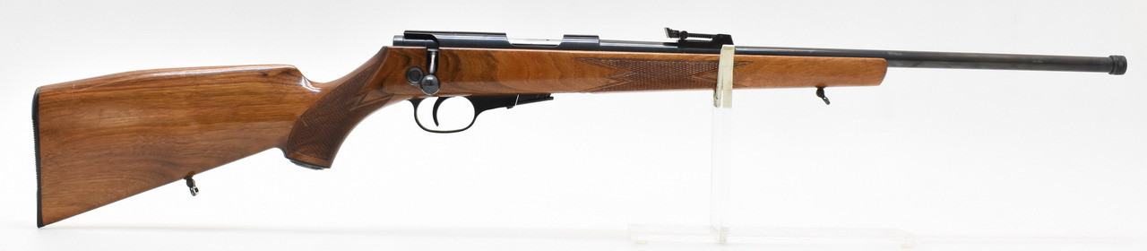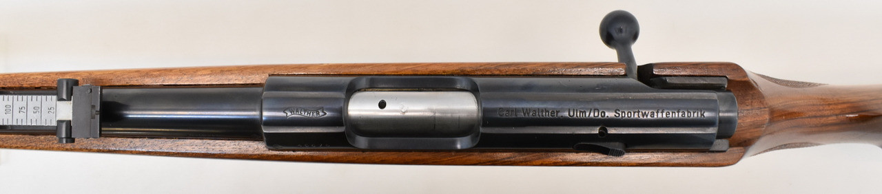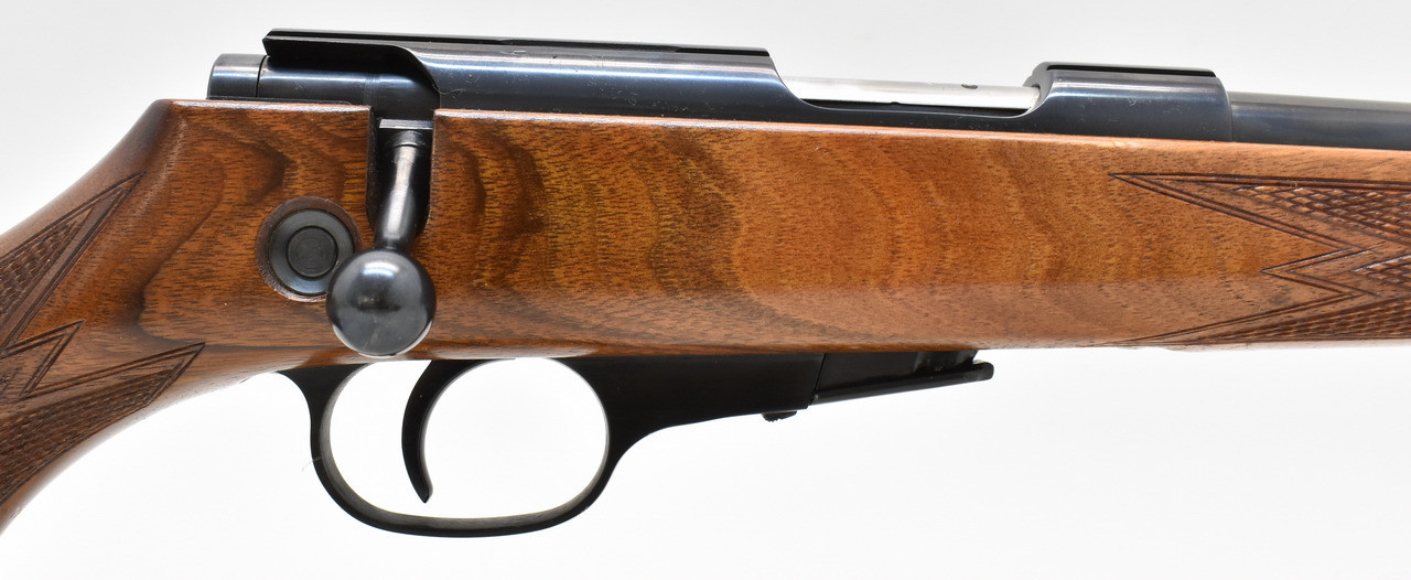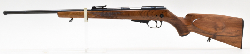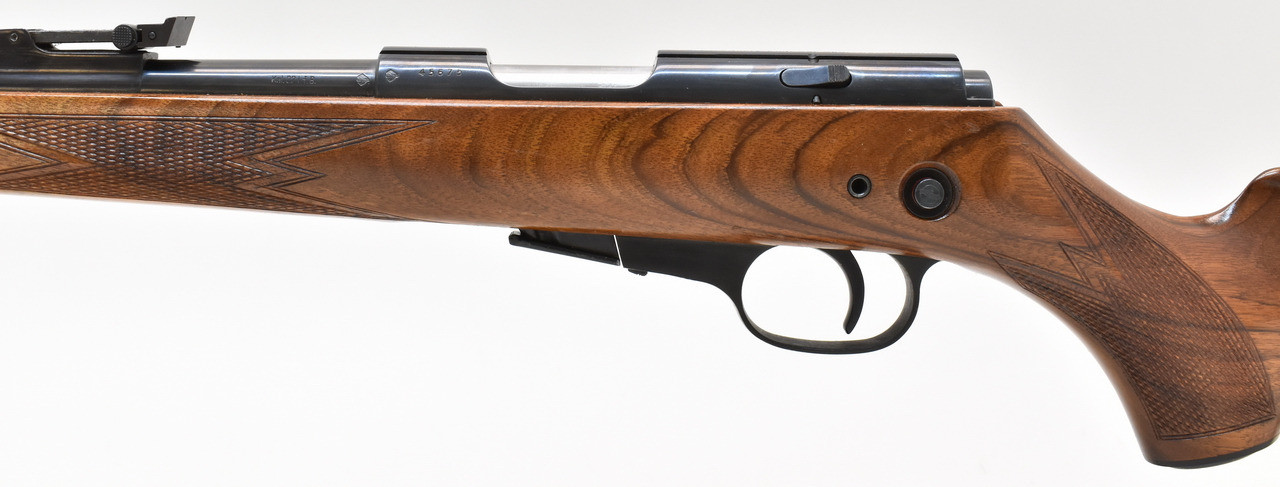 KK-Repetierer mit Druckpunktabzug, 5-Schuss Magazin und Druckknopfsicherung. Die Waffe hat einen spiegelblanken Lauf. Die Schaftlänge beträgt, gemessen vom vorderen Abzug bis Mitte Schaftkappe, 36cm.