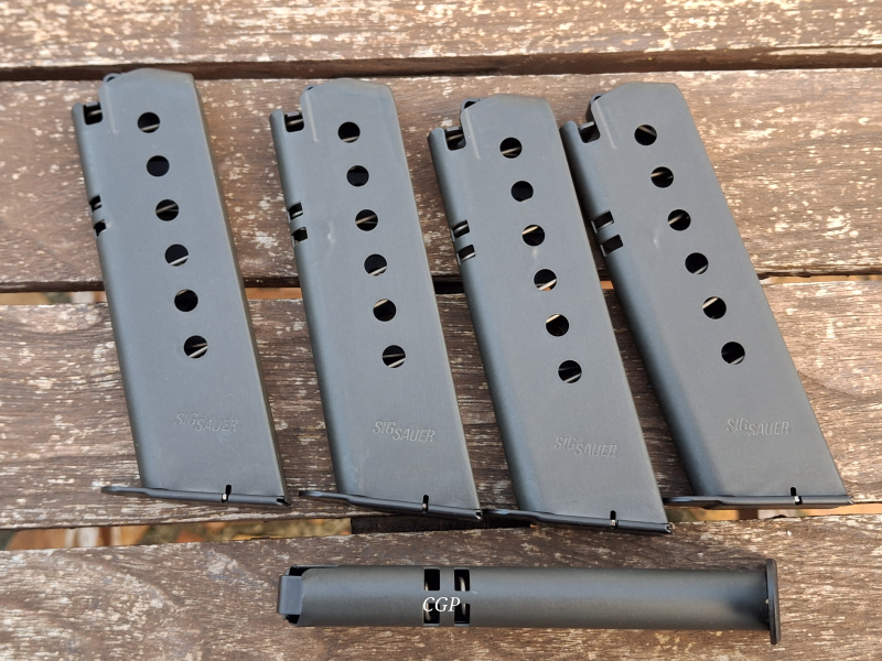 Modell / Marke : Sig Sauer P220 Classic Line / X-Serie Teil : 5 original Magazine Kal. .45 ACP deutsche Sig Sauer Fertigung für Modelle mit oben liegendem Magazinhalter Zustand : fabrikneuer Originalzustand ; siehe Bilder