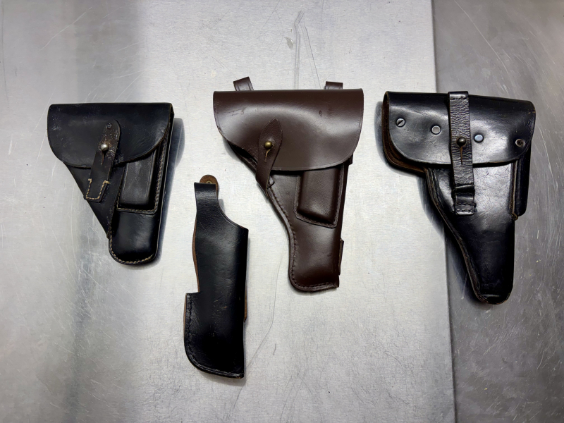 Sie bieten hier auf insgesamt 4 gebrauchte Holster. Soweit ich das zuordnen kann, passt das linke für eine Walther PP. Die anderen sollten für die Walther P1/P38 passen. Gestempelt ist nur das rechte. Es sind keine groben Spuren des Gebrauchs vorhanden und sie riechen schön nach Keller, wie sich das für altes Lederzeug gehört.