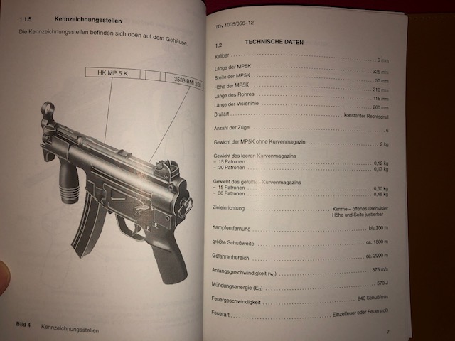 Seltene MP5K Vorschrift, 65 Seiten, beschreibt die Waffe mit Handhabung und Zubehör wie Magazinklammern und dem Zerfallkoffer.