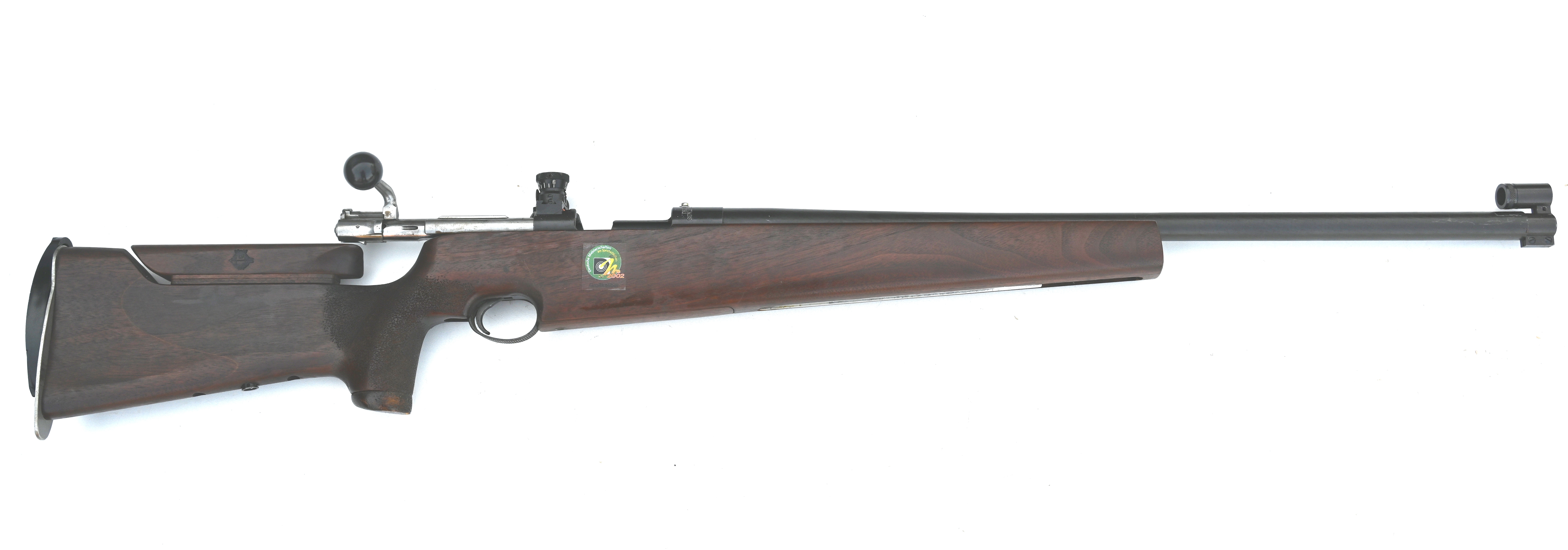 Ein (entfernbarer) runder Aufkleber rechts zeugt von einer Wettkampfteilnahme des Vorbesitzers bei den deutschen Meisterschaften im Großkaliber-Sportschießen im Jahr 2002.