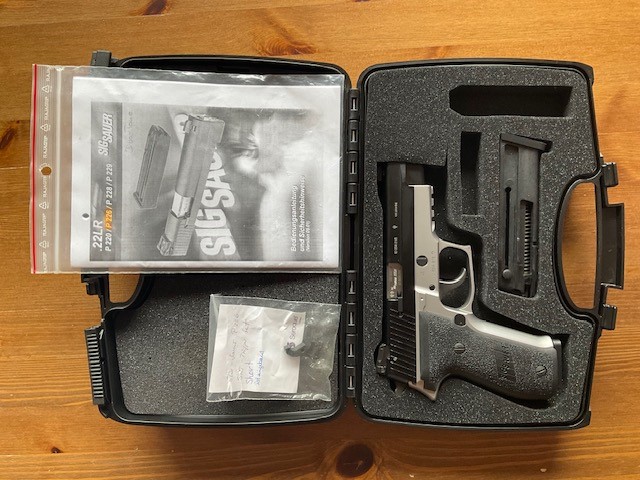 Verkaufe Pistole SIG Sauer P 226 im Kal. .22lr, Zustand: Bestzustand. Zubehör: Res.-Magazin, Anleitung, SIG-Sauer Koffer. Verbaut ist ein Short-Reset-Trigger (Originalteile werden mitgeliefert). Super seltene Variante der P 226 mit nummerngleichem KK-System. Stahlgriffstück! Sichere Funktion mit HV Munition (CCI Blazer, CCI MiniMag etc.). Versand nur innerhalb DE per Kurier. Ausländische Bieter müssen nach der Aktion einen deutschen Händler für den Export benennen. Verkauf der Waffe erfolgt im Auftrag. Privatverkauf: Kein Umtausch, keine Garantie, keine Rücknahme