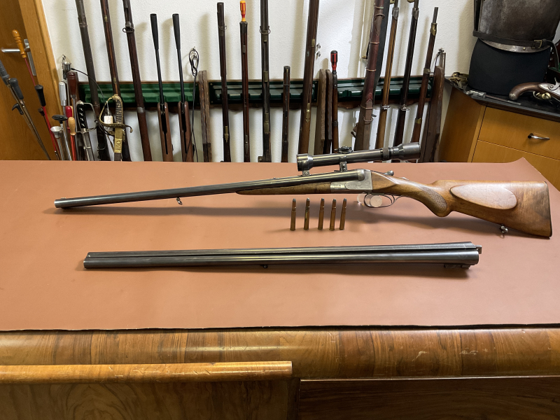 Zum Verkauf steht eine Querflinte im Kaliber 16/65 mit nachträglich angefertigtem Büchsflintlauf der Firma R. Freibeger (Augsburg) im Kaliber 8x57R (360 Nitro). Das Patronenlager des Büchslaufs ist rau; eine leere, abgeschossene Hülse wurde zu Prüfzwecken blau eingefärbt und in das Patronenlager eingesetzt, dabei zeigte sich die Rauheit deutlich. Zur Instandsetzung ist eine Patronenlagerreibahle erforderlich. Aufgrund des defekten Patronenlagers erfolgt der Verkauf ausdrücklich als defekt sowie unter Ausschluss von Rücknahme und Gewährleistung. Abgabe nur an Büchsenmacher oder Inhaber einer Waffenhandelserlaubnis.