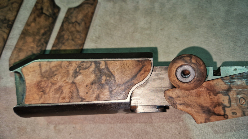 Alle Teile sind aus demselben Holz gefertigt – türkischem Nussbaum. Der Kammergeriff ist mit einer innovativen Gummischeibe ausgestattet, die ein Verrutschen verhindert. Ihr Durchmesser beträgt 26 mm, und die hölzernen Seitenplatten sind ca. 1,7 mm dick. Sie sind weder geschliffen noch geölt! Leider spreche ich kein Deutsch und benutze Google Translate. Daher bitte ich um Entschuldigung für etwaige Ungenauigkeiten in der Übersetzung und zögern Sie nicht, mich zu kontaktieren.