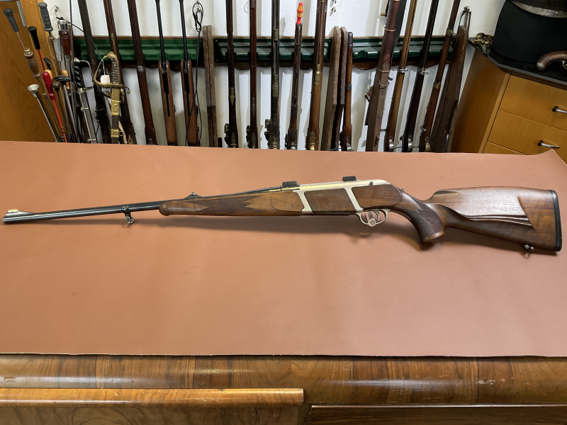 Zum Verkauf steht eine Repetierbüchse der Firma Krico im Kaliber 7x64 mit Beschuss Adler N München (11/1997). Lauflänge 57 cm, Gesamtlänge 111 cm, Schaftlänge 36 cm. Mit Handspannung, montierten EAW-Schwenkmontageblöcken, französischem Rückstecher sowie Dreischuss-Wechselmagazin. Geringe Gebrauchsspuren.