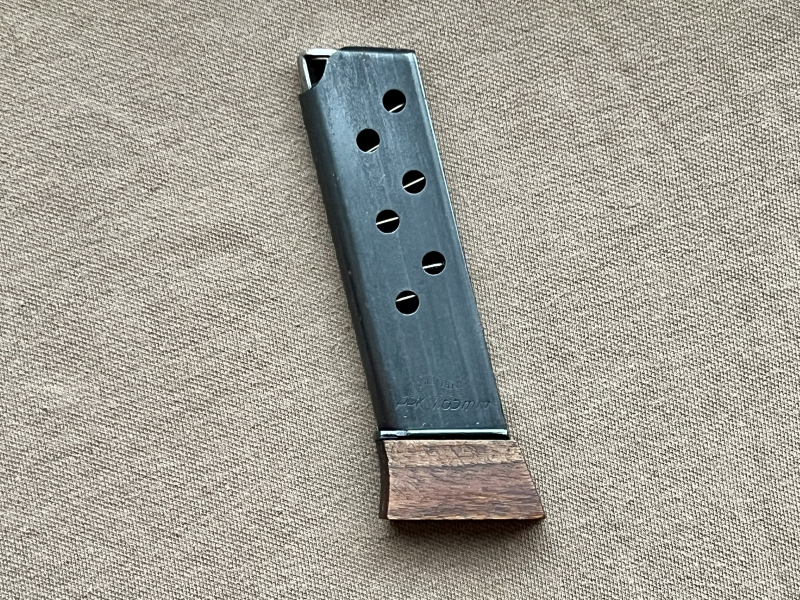 Das Magazin verfügt über eine Verlängerung aus Holz. Hier wurde ein geänderter Magazinboden verbaut der exakt mit der vorderen Kontur des Holzbodens übereinstimmt. Selten zu finden in der Ausführung.