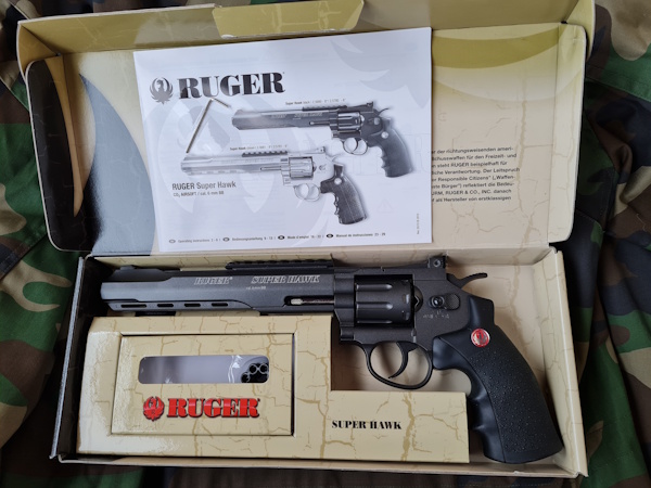 Der 8" Ruger SuperHawk CO2 Airsoft Revolver cal. 6 mm BB (Energie <4.0 Joules) mit Originalverpackung und deutscher Bedienungsanleitung ist noch unbenutzt.