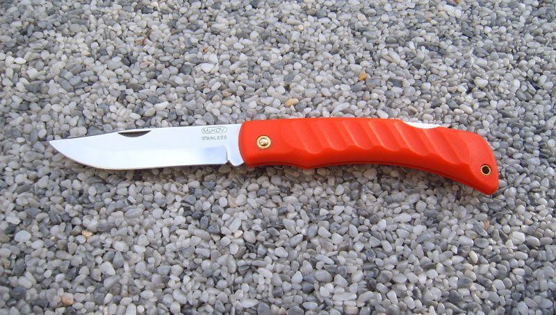 Edelstahlklinge 9 cm lang, Gesamtlänge des Messers 20,8 cm, Gewicht 81 g. Griff aus rotem FRN-Kunststoff.