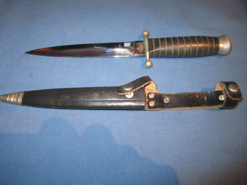 Alter Dolch von Hubertus Solingen Rostfrei mit aufwändiger Lederscheide und zwei Lederlaschen, 26 cm lang, Klinge 15 cm, wohl 50 er Jahre, schönes Sammlerstück
