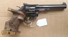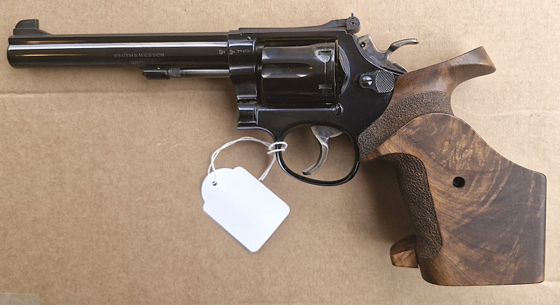 Sie bieten auf einen Revolver von Smith & Wesson, Modell 14-3 Masterpiece im Kaliber .38Special. Der Revolver befindet sich im sehr guten Zustand und wurde auch nicht sehr viel geschossen. Die Qualität des Revolvers ist hervorragend, typisch für das Baujahr 1971. Die Brünierung ist hochglanzpoliert. Der Lauf ist innen sehr gut, das Timing einwandfrei, das Trommelspiel gering. Der Revolver verfügt über einen breiten Target Abzug mit Triggerstop und einen breiten Target Hahn. Das Visier ist in der Höhe und Seite verstellbar, der 6" Lauf hat ein gerades Targetkorn. Der einstellbare und punzierte Sportgriff aus schönen Nussbaumholz von Karl Nill passt für Rechtshänder mit einer ungefähren L-XL Hand (Gr. 8,5-9,5) hervorragend. Ein sehr schöner Match-Revolver, ideal für das Targetschiessen und auch für Vereine. EWB erforderlich, internationaler Versand nur durch einen zu benennenden deutschen Händler.