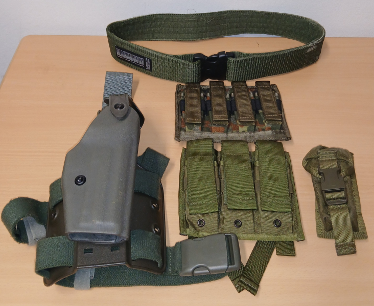Zum Angebot kommt ein fünf teiliges Set, bestehend aus einem Original Safariland Oberschenkelholster für die HK USP oder auch für die P8 der Bundeswehr, einer dreifach Magazintasche für doppelreihige Pistolenmagazine von 75Tactical, einer vierfach Molle Magazintasche in flecktarn ebenfalls für Pistolenmagazine von KHS Products, einer einzelnen Molletasche für Tools oder Magazine von einem unbekannten Hersteller mit einem zusätzlichen Malice-Clip sowie einem original Blackhawk Gürtel in Oliv.