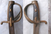 Messinggefäß mit geschlossenem Griffrücken, mit Stempel „Versailles“ auf einer Spange, Hersteller auf Klingenrücken „Manufactur de Solingen“ und weitere 4 Buchstaben. Griff Holz mit Leder überzogen dieses ganz leicht beschädigt. Klinge und Scheide (2 Trageringe) leicht rostnarbig.