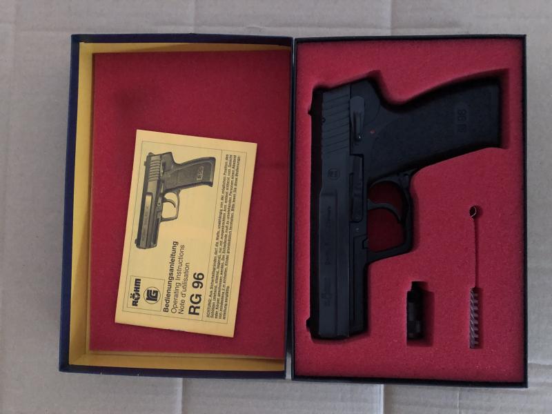 Gas/Signalpistole Röhm RG 96 Kal. 9mm P.A.K. PTB 699. Frühe Ausführung noch mit M10 Laufgewinde. Guter Zustand - Gebrauchsspuren vorhanden, Brünierung am Schlitten etwas verblasst, Lauf brüniert.