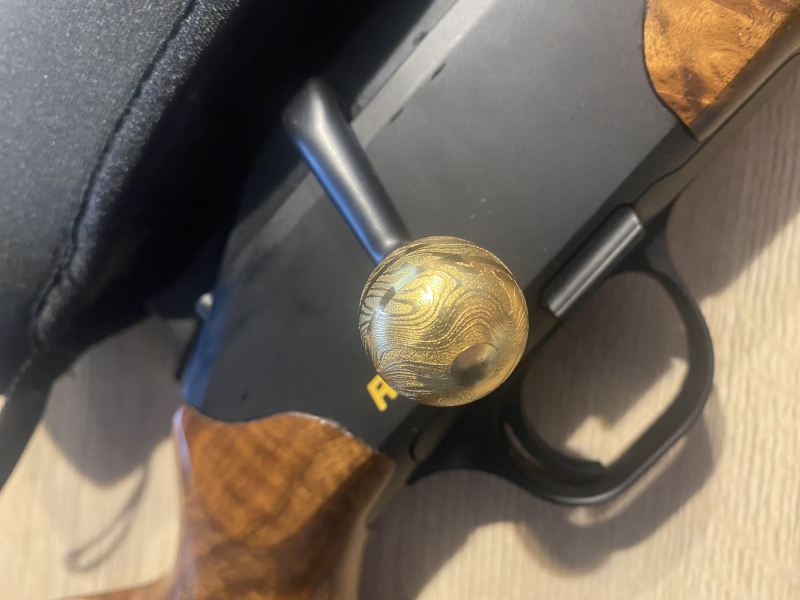 24K vergoldet!! EINZELSTÜCK!! Biete hiermit eine tolle, als neuwertig zu beschriebene Kammergriffkugel aus echtem Damast Stahl, galvanisiert mit echtem 24k Gold an (darüber ist noch eine Schutzschicht gegen Abrieb). Bewährt bei schnellem repetieren durch optimale Haptik und absoluter Blickfang, so einmalig!!!