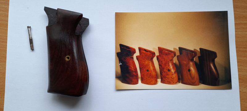 Wunderschöne vom SIG Spezialisten Walter Ruhmann aus Wüsteneisenholz gefertigte Griffschalen ohne Fangriemenöse am Griffstück!