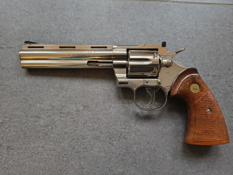 Biete eine schon lange nicht mehr erhältliche Colt Python Fire Cap Gun in der 6 Inch Stainless Steel Variante an. Der Hersteller müsste Kokusai sein aus Japan sein. Die Modellwaffe ist komplett aus Metall, ist dem Original bis ins kleinste Detail nachempfunden und kann auch so zerlegt werden. Sie kommt mit 6 Metallhülsen für 5mm Plug Fire Caps.