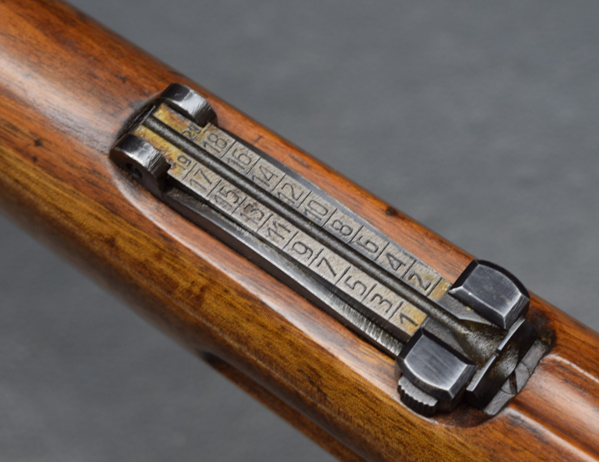 Bajonetthalter, Putzzeughülse, eingeschwalbtes Korn, schiebe Visierung, brüniertes System, Herstellerwappen und das Jahr 1950 auf dem Hülsenkopf,