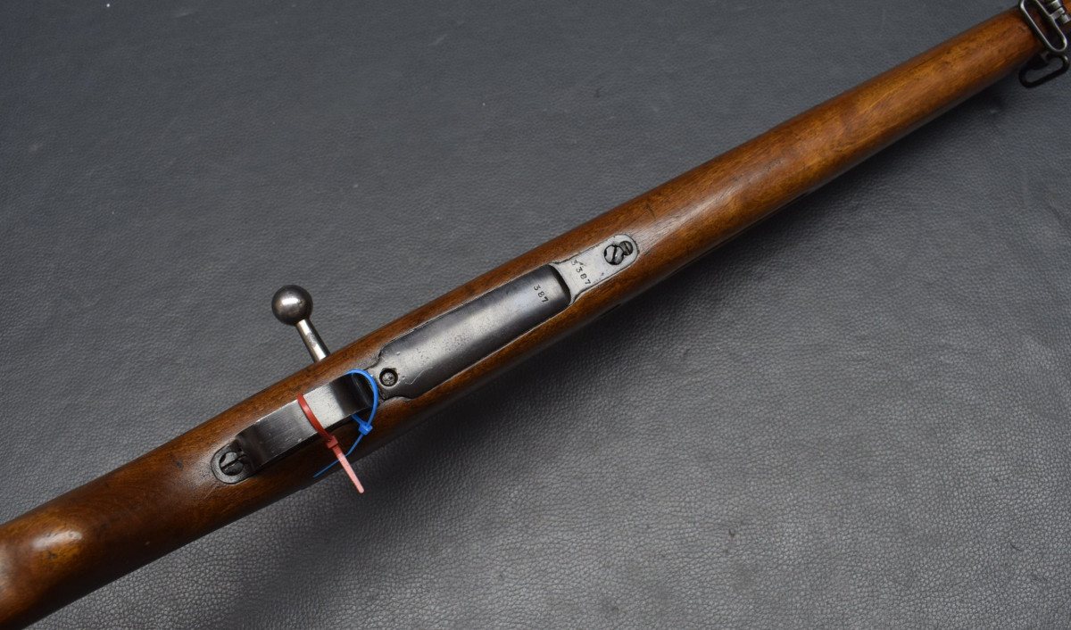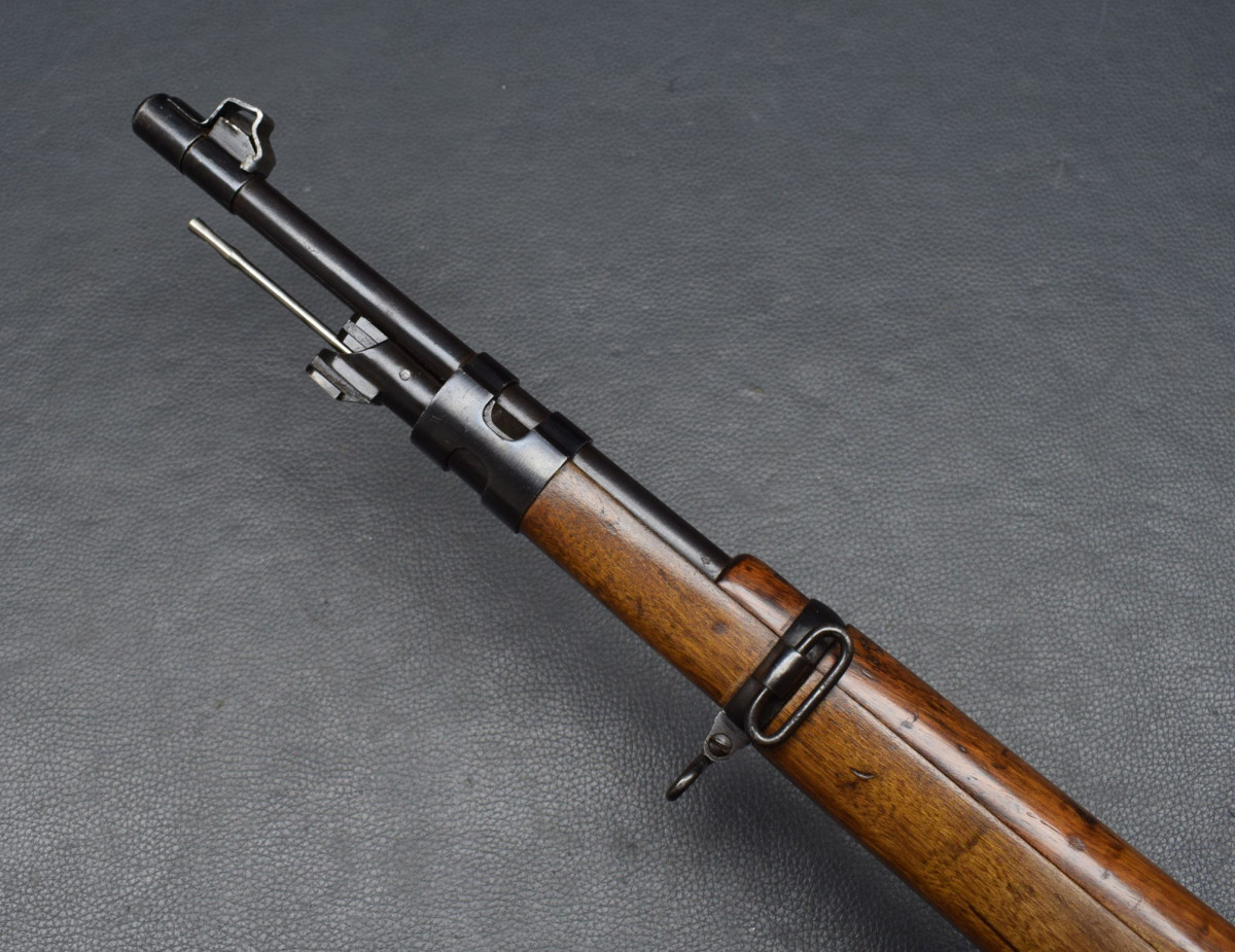 Nußbaumschaft mit Stahlschaftkappe . Lauf sehr gut, Brünierung 98%, Schaft sehr gut