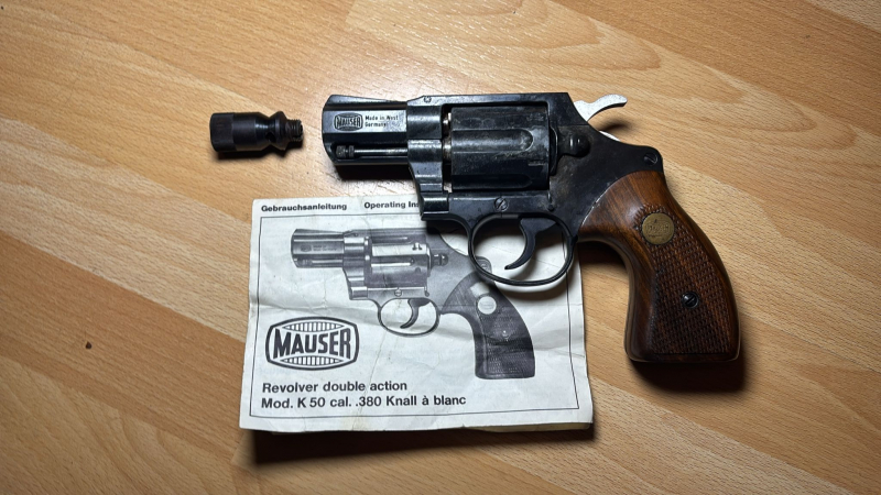 Hallo biete einen Revolver Modell MAUSER K50,MIT HOLZGRIFFSCHALEN.ER IST GEBRAUCHT.KALIBER 9MM/380KNALL