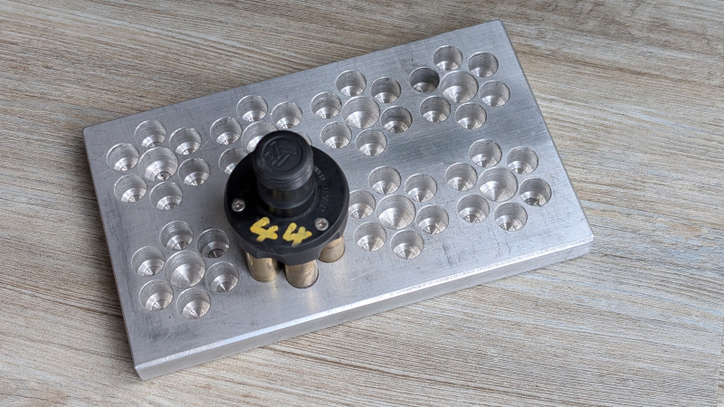 Biete für .44 Magnum Speedloader diese CNC gefräste Alu-Picplate zum einfachen Bestücken der Speedloader.
