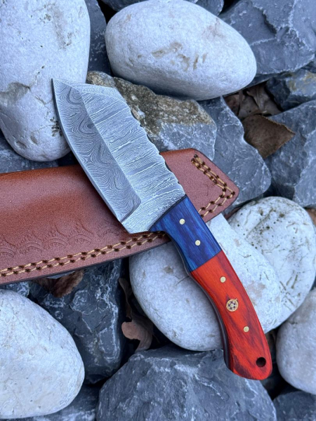 Hier erhalten Sie ein sehr schönes Hand geschmiedetes Damast Jagd Messer in reizvollem schöner Klingenmaserung + Leder Scheide