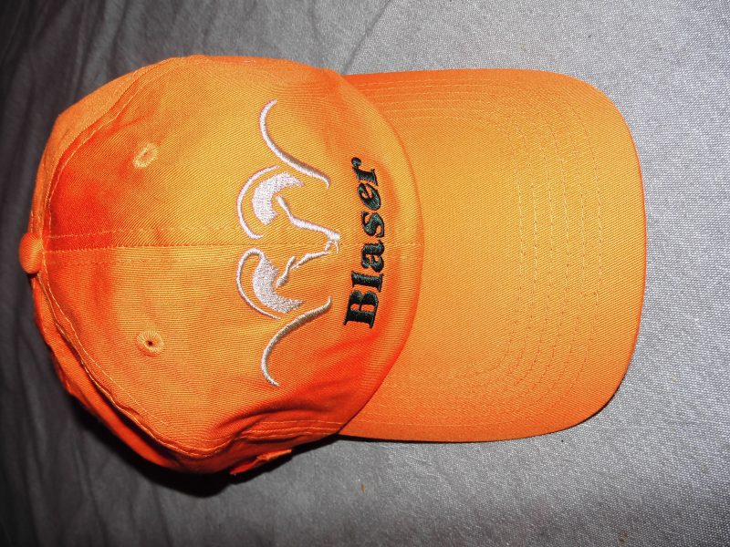 Abzugeben ist eine ungetragene Basecap der Fa. Blaser, orange mit schwarzgoldenem Firmenlogo.