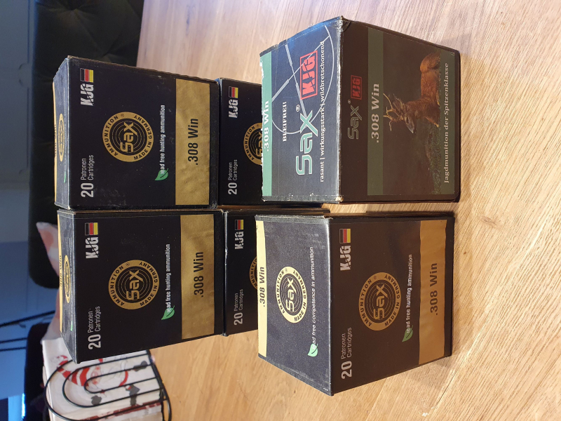 Verkauft werden 100 Patronen im Kaliber .308 Win. von KJG mit KJG-Geschoss. Die Munition ist aufgeteilt in zwei Lose zu je800 Patronen und 20 Patronen, die zusammen erworben werden können.