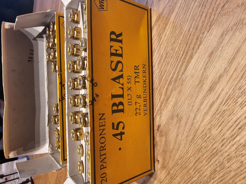 Verkauft werden 27 Patronen im Kaliber 45 Blaser von WR und7 Hülsen, aus einem Los.