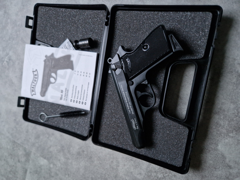 Zum Verkauf steht eine Walther PP brüniert, 9mm Schreckschuss PTB 923.