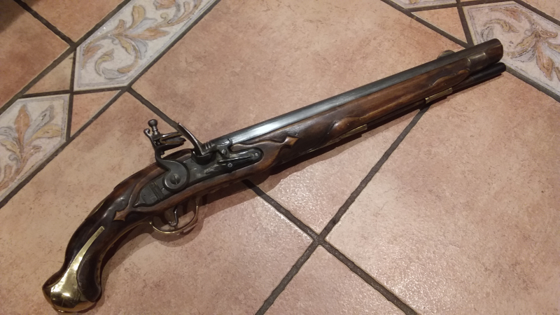 Schwere und lange Steinschlosspistole ( Gewicht ca. 1,9 kg, Länge ca. 58 cm ).Messingbeschläge relativ blank, Stahlteile fleckig und dunkel, teilweise flugrostig. Schlossfunktion gegeben ( 2 Rasten ), Feder ziemlich müde (schussfähig? ). Waffe entspricht m.E.dem im Buch " Die Bewaffnung Brandenburg/Preußen 1640-1806" abgebildeten Exemplar (siehe Foto). Privatverkauf, keinerlei Gewährleistungs-bzw. Garantierechte.