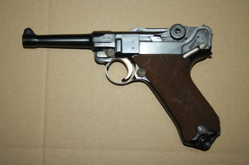 Sie kaufen diese orig. WK1 Luger P08 aus 1916er DWM-Fertigung im Kal. 9x19. Die Pistole hat beide Weltkriege überlebt und wurde vom Vorbesitzer durch einen Büchsenmacher aufarbeiten lassen. Sichtlich nummerngleich und guter Lauf. Funktion einwandfrei. Kein gültiger Beschuss, daher Verkauf nur an Händler und Sammler!