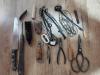 Sammlung an altem Werkzeug eines Schuhmachers : Raspel , Ahlen , Pechfaden mit eingedrehter Kunststoffborste , Lederschere usw - Privatverkauf