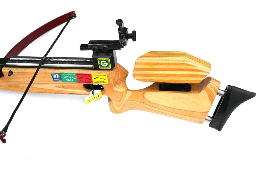 Hochwertige Armbrust, Match-Armbrust mit Tunnel- und Dioptervisierung, Bogenschleuder, Swiss-made Match-Crossbow aus Schweizer Spitzenfabrikation: