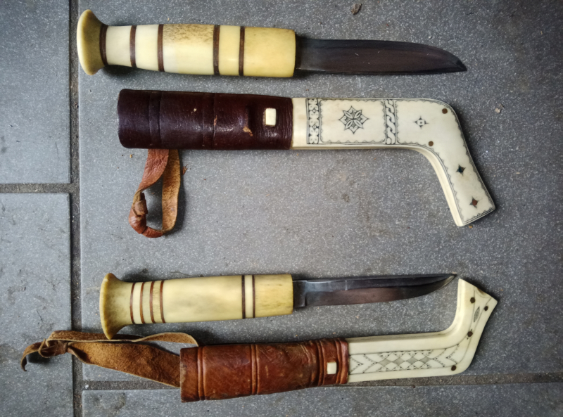 Zwei sehr alte und schöne sumi Jagdmesser. Der Vorbesitzer war dort über Monate jagen und hatte viel Kontakt zu den Urvölkern. Griff und Scheide sind aus Rentier Horn.