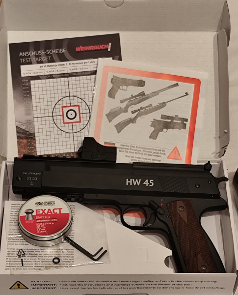 Zum Verkauf steht eine Weihrauch HW 45 in neuerer Fertigung mit oberer und unterer Picatinny-Schiene. Die Pistole befindet sich in sehr gutem Zustand und wurde nur wenig genutzt. Verkauf erfolgt aus Zeitmangel.