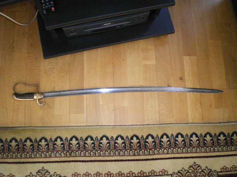 Riesiger antiker Kavalleriesäbel. Gebraucht. Gesamtlänge 97cm, Klingenlänge 85,5cm. Ca.3cm breit. Die Spitze der Klinge ist zweischneidig. Der Griff besteht aus Messingbeschläge, der Griffkorn ist aus Holz. Lederbedeckung mit Messingdraht Wicklung. Guter Gebrauchter Zustand.