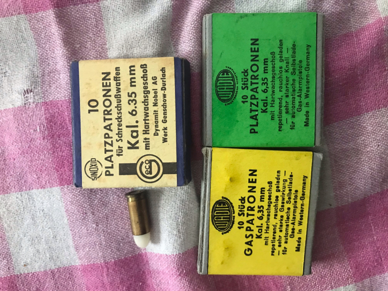 Von Privat aus einem Nachlass im Auftrag an EWB : 30 Patronen im Kaliber 6.35 : 20 x Platz und 10 x Gaspatronen - ältere Fabrikpatronen. Von Privat, daher keine Garantie oder Rücknahme - Versandpauschale 6 Euro -