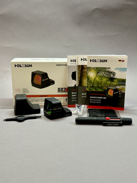 Zusätzlich zum Rotpunktvisier liegt die Originalverpackung, das originale Werkzeug, original Schrauben, Ersatzbatterie und Broschüren bei. Den Holosun Cleaning Pen zur Reinigung des Glases gebe ich ebenfalls mit dazu.