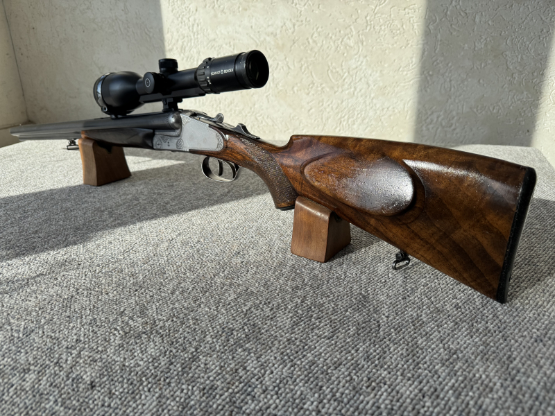 Verkauft wird ein Drilling von Heym mit separater Kugelspannung und Schmidt&Bender Zenith Zf 2,5-10 x 56, Leuchtpunkt, Absehen 1,montiert auf Suhler Einhakmontage,Kal.30.06,12/70, Lauflänge 63 cm, Schaftläne 36,5 cm, sehr schönes Wurzelmaserholz vom Wallnuß mit deutscher Backe und Schweinsrücken, Fischhaut abgegriffen,sonst sehr gut gepflegt, Verschluss fest, seitlich am Baskül wurde der Schaft an einer kleinen Stelle mal nachgeklebt (kein Bruch) Beschuss siehe Stempelung.Verkauf im Auftrag