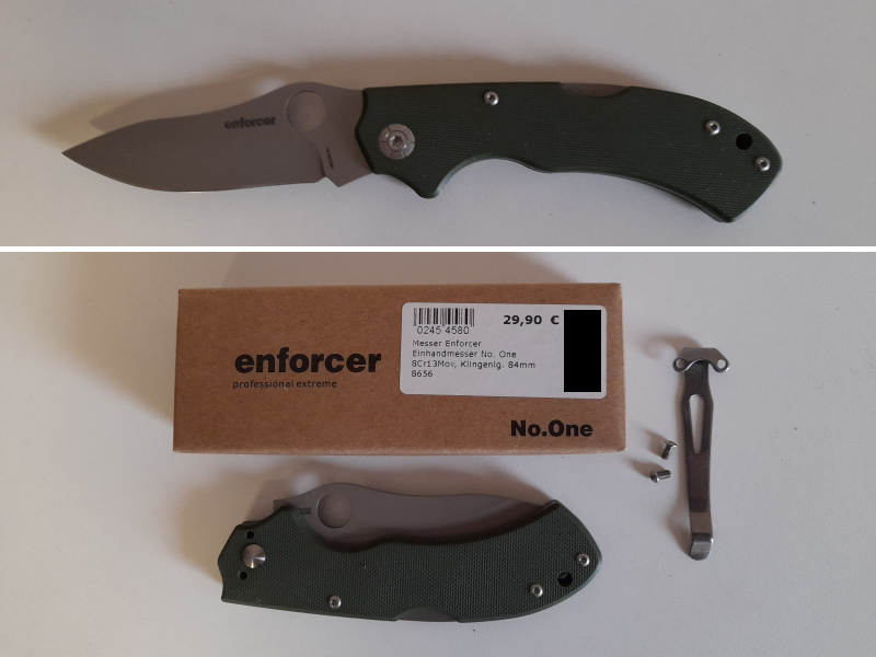 Das Messer hat einen Gürtelclip, den ich für ein Taschenmesser unnötig finde, und der auch in der Hand stört. Deswegen habe ich ihn abgeschraubt, aber er liegt noch bei. Eine Bohrung am Griff für eine Fangschnur ist vorhanden. Die Originalverpackung ist ebenfalls Teil des Lieferumfangs.