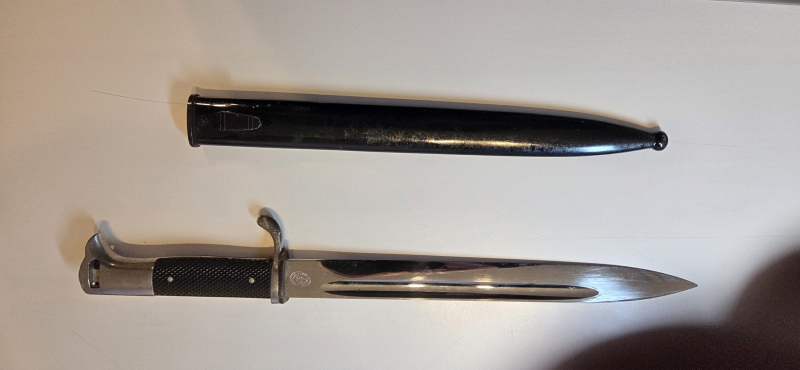 gut erhaltenes Ausgehbayonette, Wehrmacht 2. WK, Original, Hersteller Carl Eickhorn, Solingen, mit genieteten Bakkelitgriffschalen, Gesamtlänge mit Scheide: ca. 41 cm, Klingenlänge: ca. 25 cm. Es fehlt leider die Arretiereinrichtung für den Karabiner K98